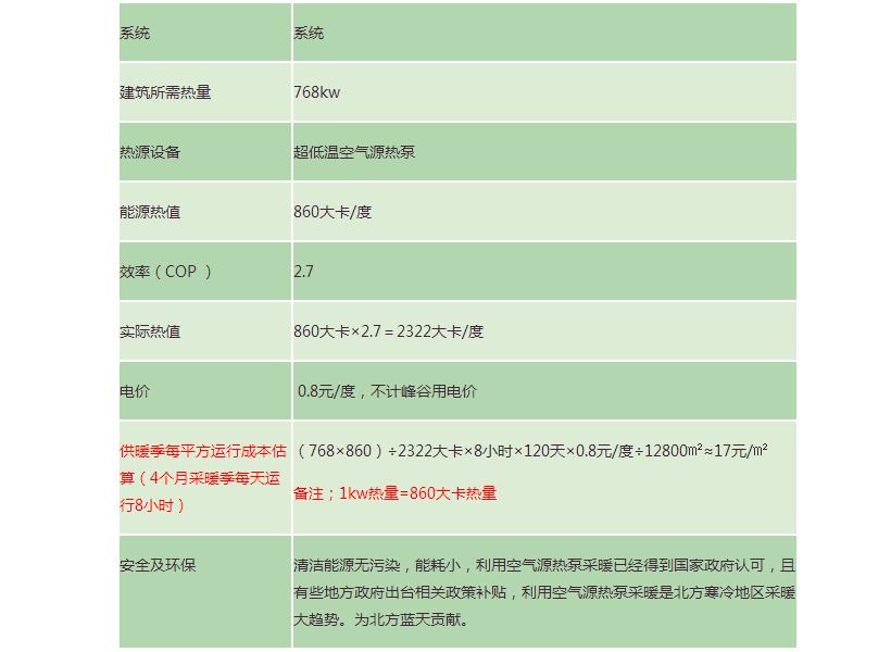 采暖預(yù)測能耗,計(jì)算耗電總量,按照每天供熱運(yùn)行8小時(shí),供熱季120天,電價(jià)0.8元/度折合每平方(整個(gè)采暖季)運(yùn)行成本,室內(nèi)溫度達(dá)到20℃±2℃,以下預(yù)測能耗不含系統(tǒng)循環(huán)水泵運(yùn)行能耗。